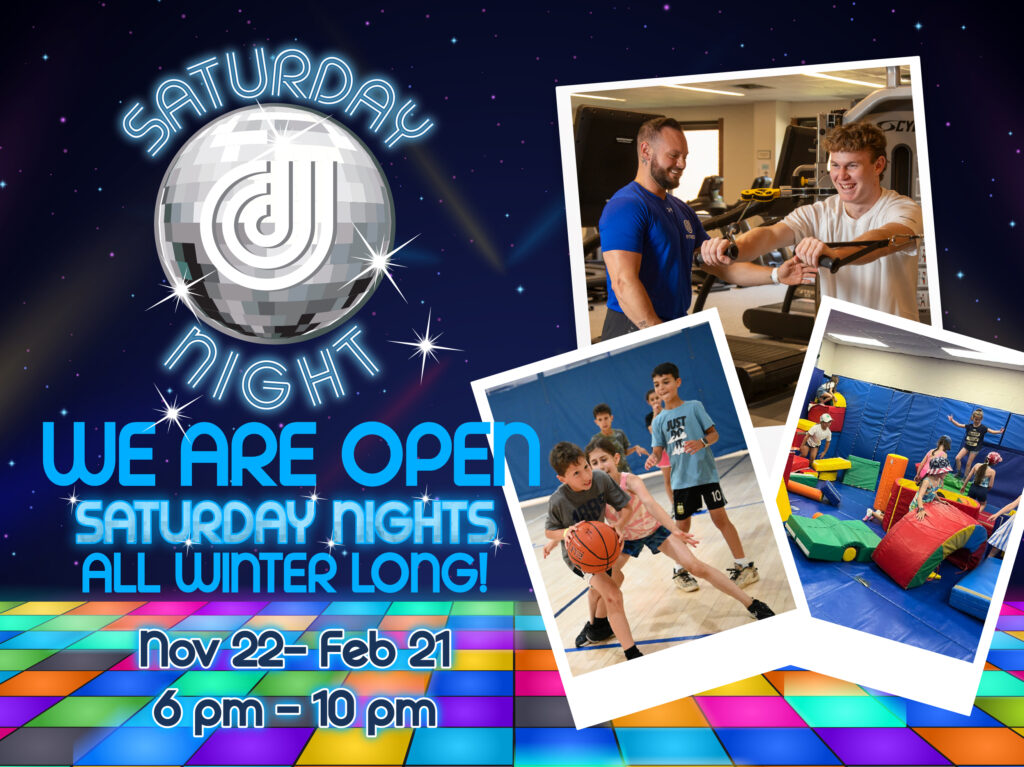 Join us on Saturday evenings from 6–10 PM for extra time to swim, shoot hoops, lift, play, and stay active. The Sadinoff Fitness Center, basketball gyms, indoor pools, Tumble Room, and Seiden Wellness Center will all be open for you and your family.
