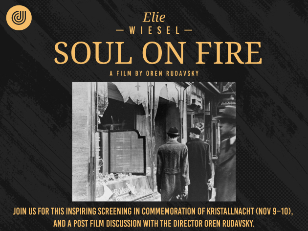 ElieWiesel: Soul on Fire Date Mon, November 10 Time 7:30 pm – 8:30 pm Please join us for this inspiring documentary in commemoration of Kristallnacht which falls on November 9-10 Learn More